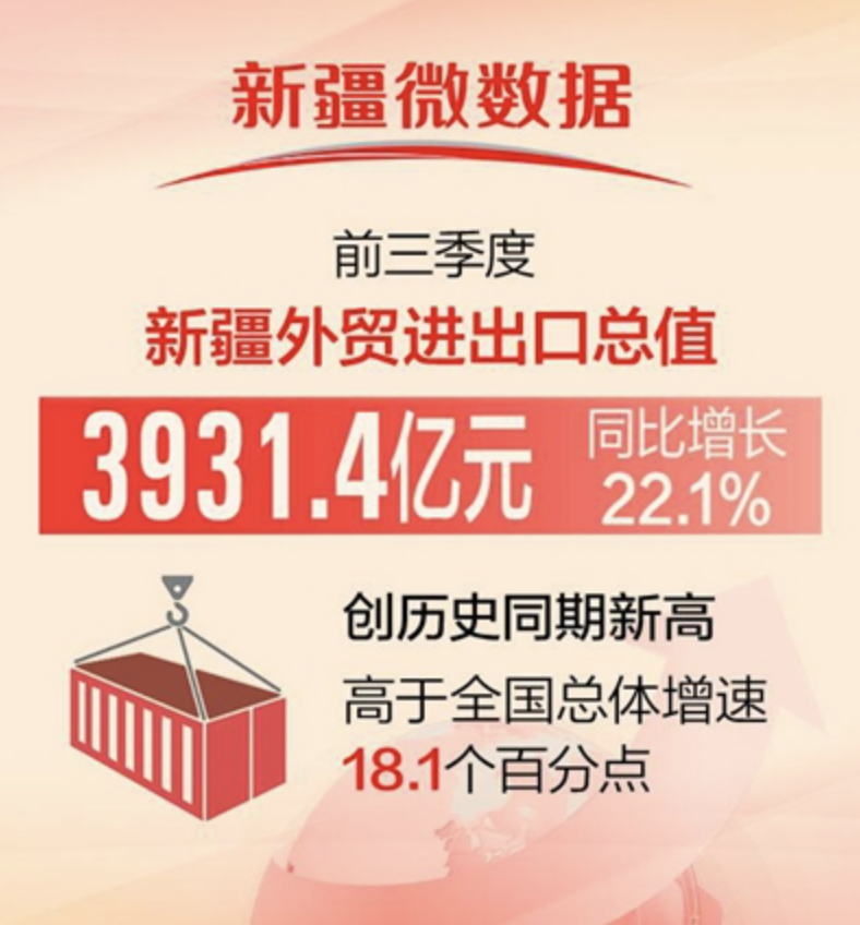 本报乌鲁木齐10月25日讯 石榴云/新疆日报记者黑宏伟从乌鲁木齐海关新闻发布会上获悉:前三季度,新疆外贸进出口总值3931.4亿元,创历史同期新高,同比增长22.1%,高于全国总体增速18.1个百分点,延续了稳中向好发展势头。