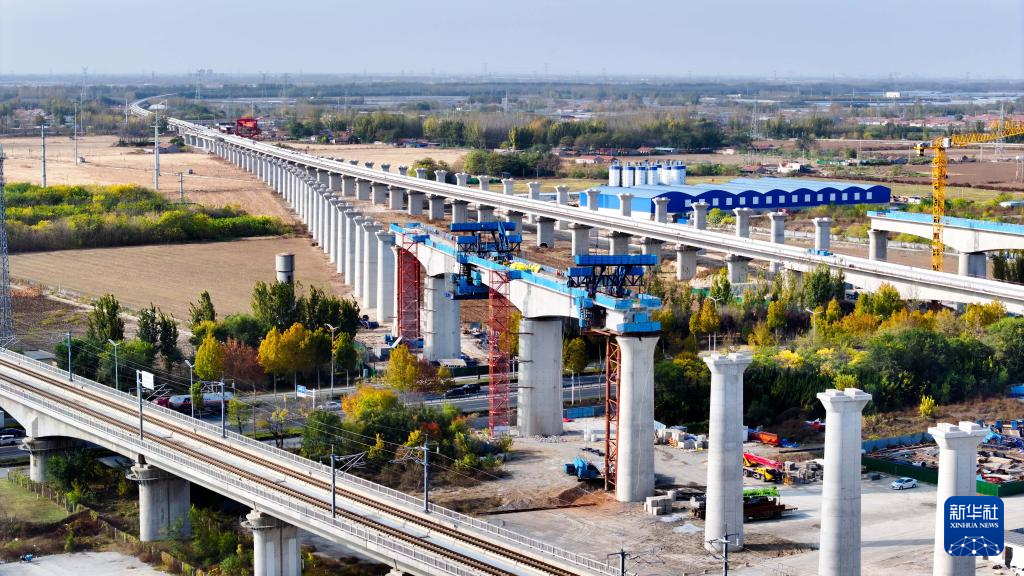 11月16日,由中铁十局承建的济(南)青(岛)高铁潍东上行联络线跨省道222和潍坊市蓝天路连续梁顺利合龙。据悉,潍东上行联络线是连接济青高铁和(天)津潍(坊)高铁的关键纽带,将为鲁北地区和山东半岛地区的互联互通注入强劲动力。 新华社记者 郭绪雷 摄