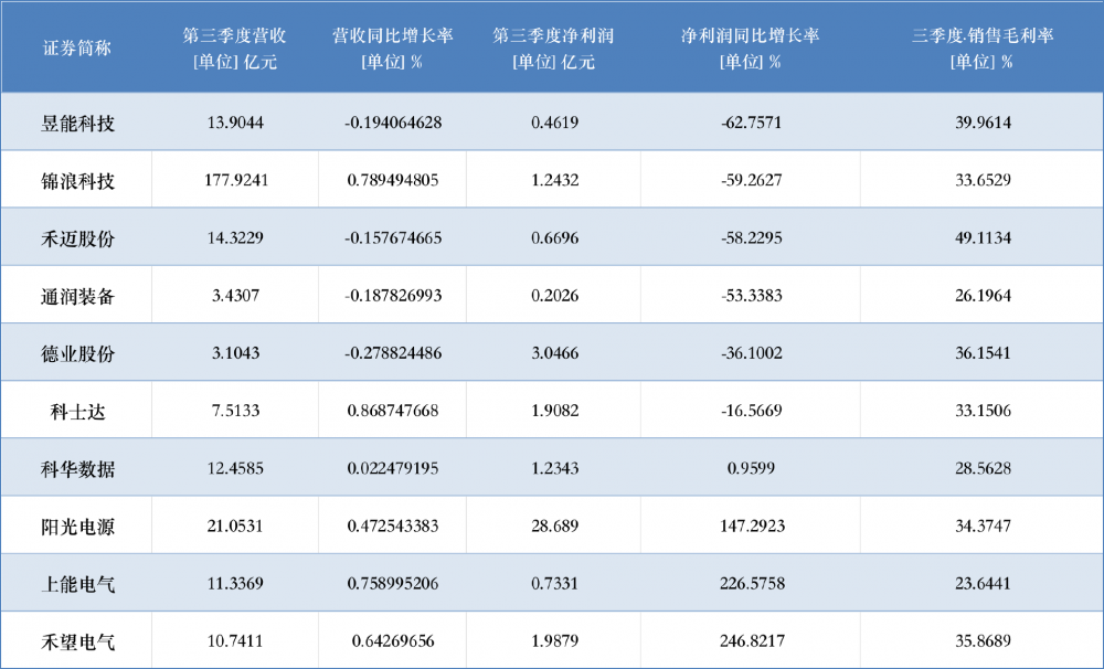 第三季度,10家企业中业绩下滑的企业共有六家,依次分别是:昱能科技、锦浪科技、禾迈股份、通润装备、德业股份、科士达。