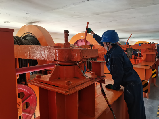 溢洪道设有三道工作闸门,是该厂最大的泄洪建筑物,在汛期遇到各种频率的洪水时均可开启泄洪。在水库水位1735米时,三孔最大流量为3800立方米每秒,最大流速达30米每秒。为提高溢洪道4、5、6号工作闸门启闭的可靠性,该厂在溢洪道4、5、6号工作闸门各安装一台无电应急启闭装置。该设备的成功安装,确保了在极端条件下即一切外来电源失电后,还能正常进行闸门的启闭操作,保证防汛度汛泄洪设备始终处于正常工作状态,避免由于闸门无法及时启闭造成的大量泥沙淤堵、弃水、漫坝和水淹厂房等事故,提升了泄洪闸门的运行安全可靠性。