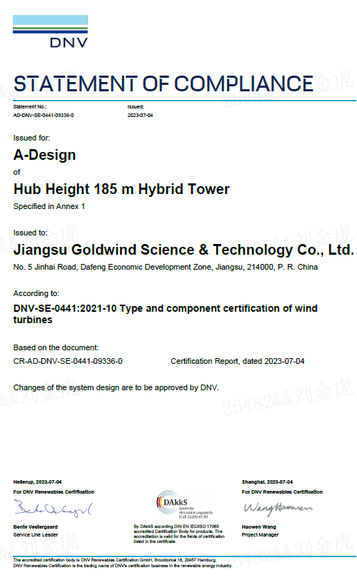 技术领先,权威认可。目前,金风科技185米钢混塔架已经获得DNV A-level设计认证证书,这也是金风科技在钢混塔架领域继95米钢混塔架获UL认证、140米钢混塔架获DNV认证后获得的第三张国际认证证书。当前,金风科技钢混塔架产品已累计获得产品设计认证及型式认证30项,全面覆盖公司的主流机型平台。