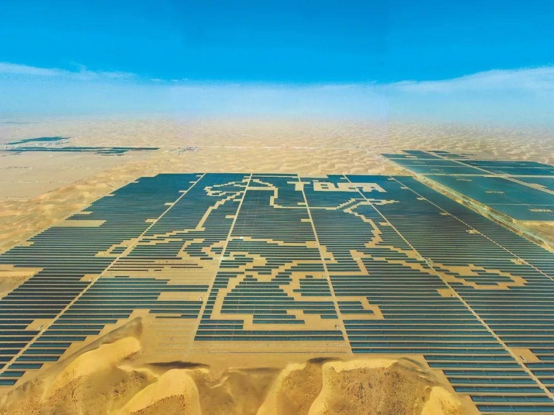 在腾格里沙漠边缘,黄沙漫天、无际沙海之上,由千万块光伏板组成的“马踏飞燕”图和TBEA的英文字样蔚为壮观。这里是由特变电工新能源公司(以下简称“特变电工新能源”)投资建设的武威武晟150兆瓦光伏发电项目,于7月11日并网发电。据测算,该项目全容量并网发电后,能在25年内提供约63亿千瓦时绿色电力,相当于节约煤炭215.6万吨、减排二氧化碳671.2万吨,为“光伏+沙戈荒治理”提供了一个可复制推广的典型案例。