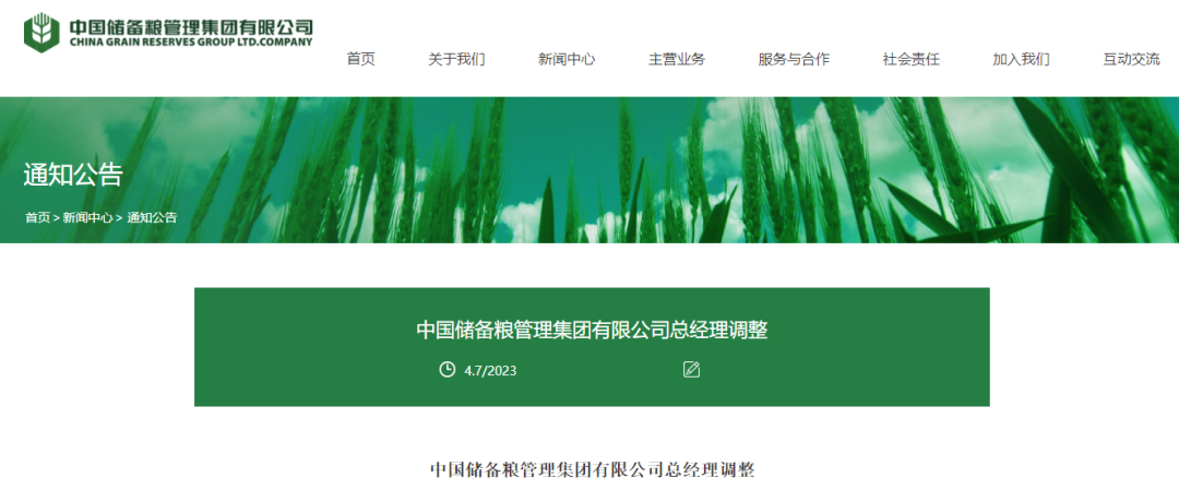 4月7日,中国储备粮管理集团有限公司召开领导班子会议。会上,宣布了中央关于中国储备粮管理集团有限公司总经理调整的决定:按照中央企业领导人员任职年龄有关规定,免去迟京涛同志的中国储备粮管理集团有限公司董事、总经理、党组副书记职务。相关免职按有关法律和章程的规定办理。