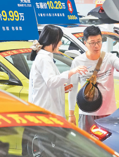 近日,商务部宣布组织开展汽车促消费活动,其中一项为“千县万镇”新能源汽车消费季活动。图为6月9日,消费者在山东烟台夏季惠民车展上了解参展汽车。唐 克摄(人民视觉)