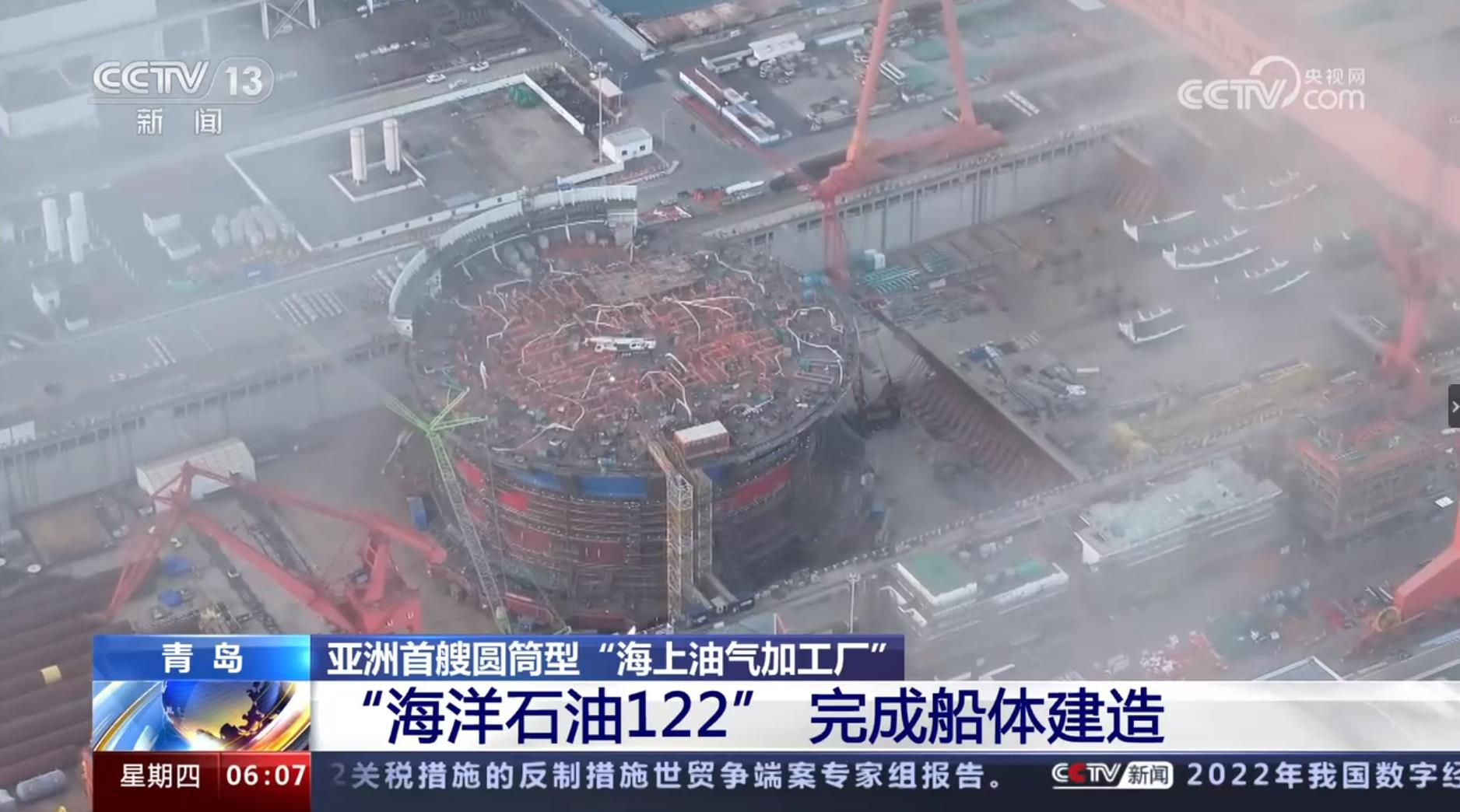 总台央视记者张丛婧:这里是青岛海洋工程装备制造基地,经过17个月的建造,这个集原油生产、存储、外输等功能于一体的“海上油气加工厂”的船体主结构完工,进入总装集成阶段。