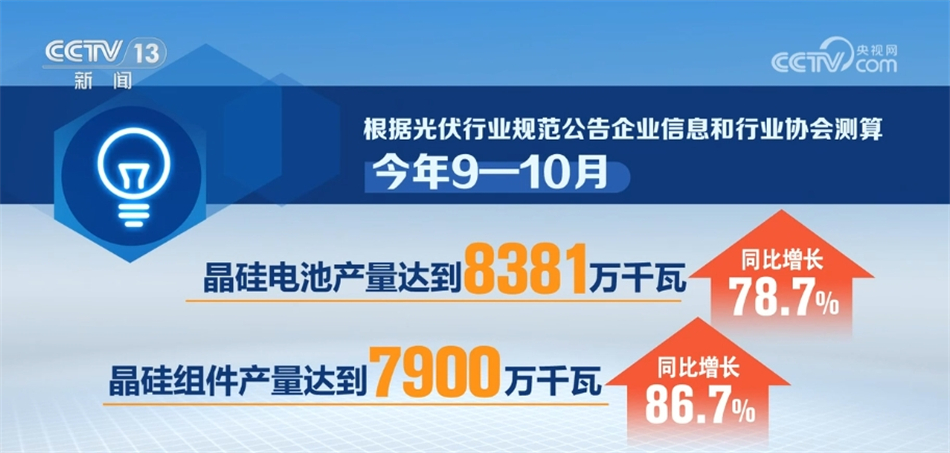 根据光伏行业规范公告企业信息和行业协会测算,今年9—10月,全国多晶硅产量达到23.66万吨,同比增长90%;硅片产量8795万千瓦,同比增长61%;晶硅电池、晶硅组件产量分别达到8381万千瓦、7900万千瓦,同比分别增长78.7%、86.7%。