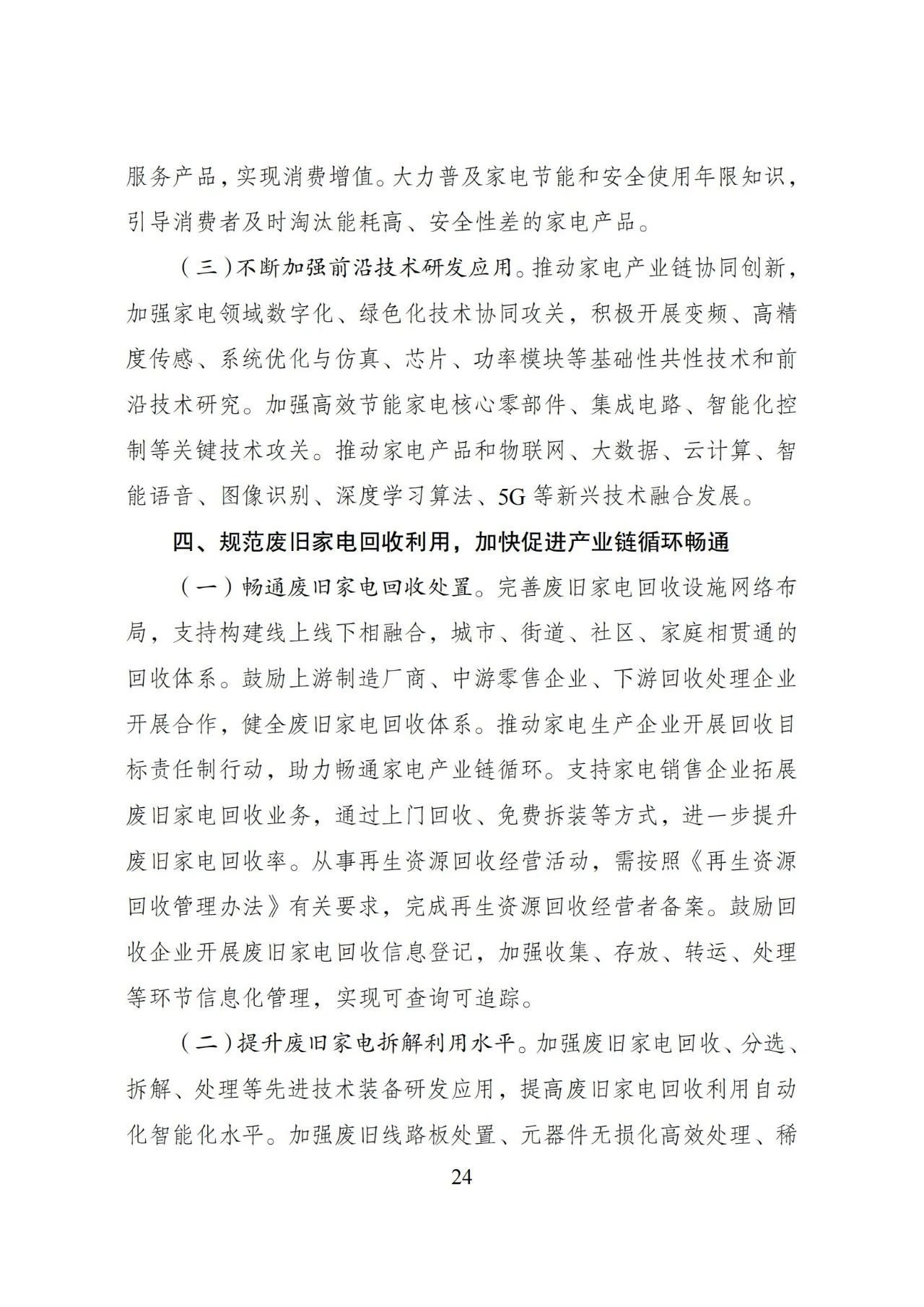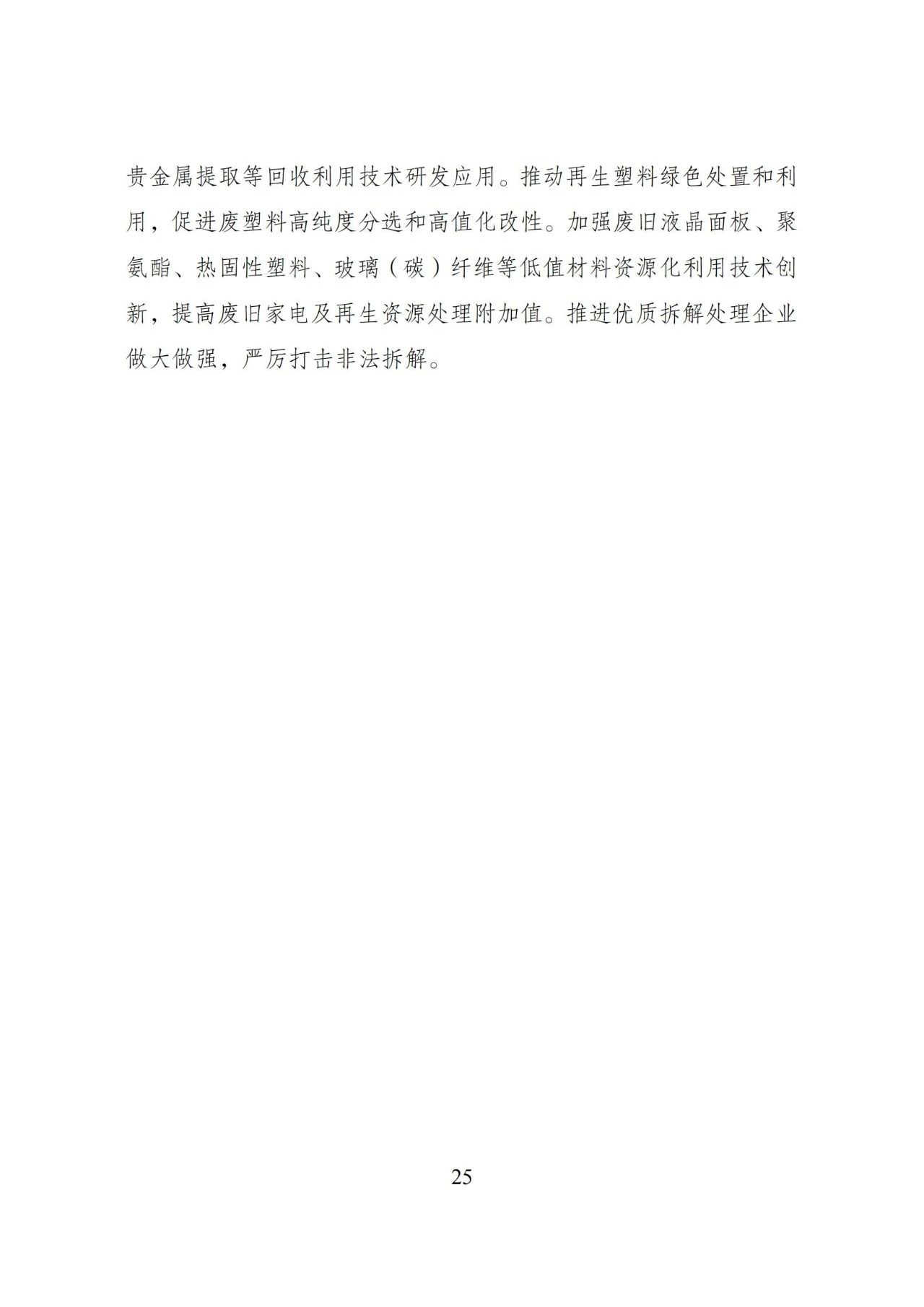 (二)推动再生资源高水平循环利用。依托废旧物资循环利用体系建设重点城市、国家“城市矿产”示范基地、资源循环利用基地,规划布局一批废旧产品设备高水平分拣中心、加工利用基地和区域交易中心,推动废旧产品设备规模化、规范化、清洁化再生利用。强化再生资源先进加工利用技术装备推广应用,支持现有加工利用项目提质改造,提高机械化、信息化和智能化水平。支持企业和科研机构加强技术装备研发,推广废旧产品设备精细拆解、复合材料高效解离、有价金属清洁提取、稀贵金属再生利用等先进技术,加强大型成套装备研发应用。