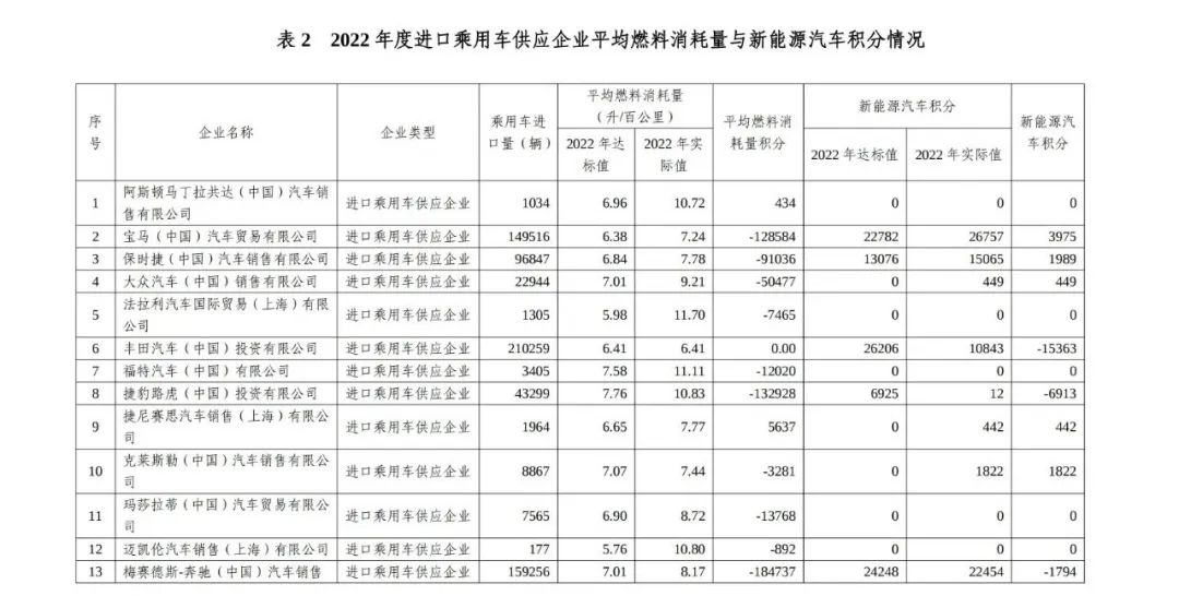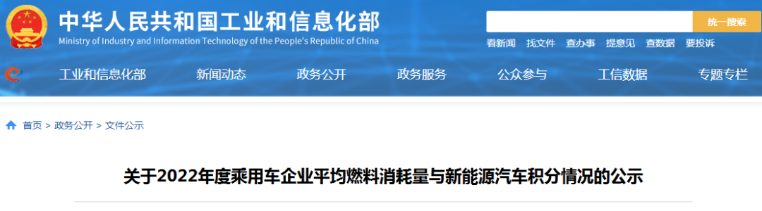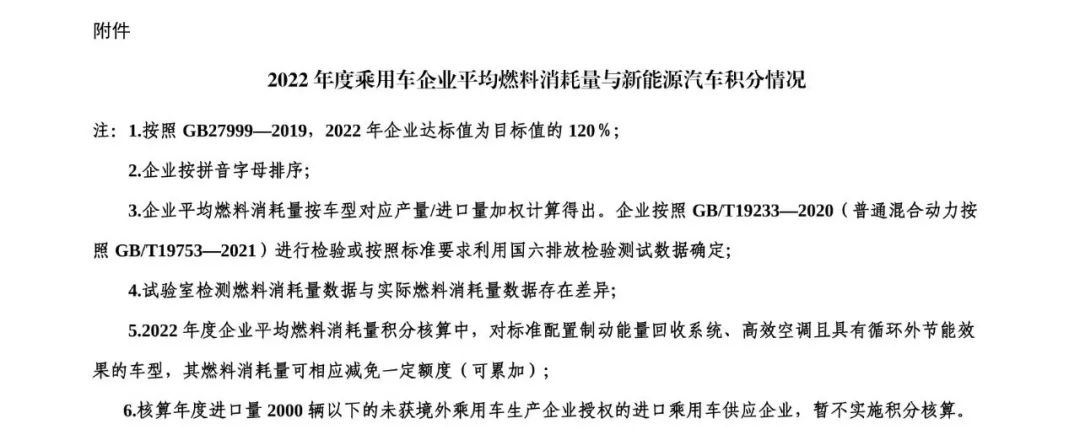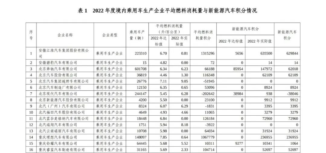 关于2022年度乘用车企业平均燃料消耗量与新能源汽车积分情况的公示