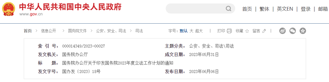 国务院2023年度立法工作计划