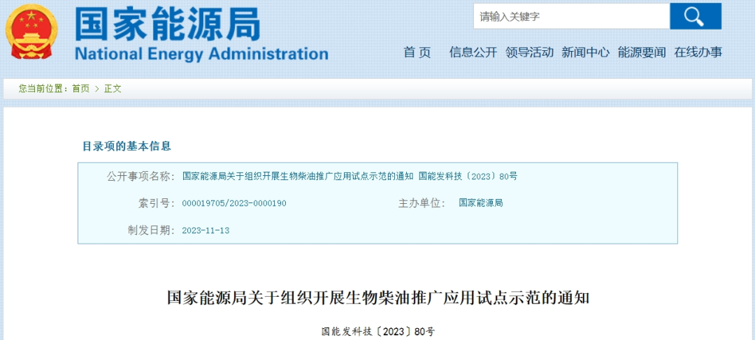 11月20日,国家能源局发布的《关于组织开展生物柴油推广应用试点示范的通知》指出,通过组织开展生物柴油推广应用试点示范,拓展国内生物柴油的应用场景,探索建立可复制、可推广的政策体系、发展路径,逐步形成示范效应和规模效应,为继续扩大生物柴油等绿色液体燃料推广应用积累经验。