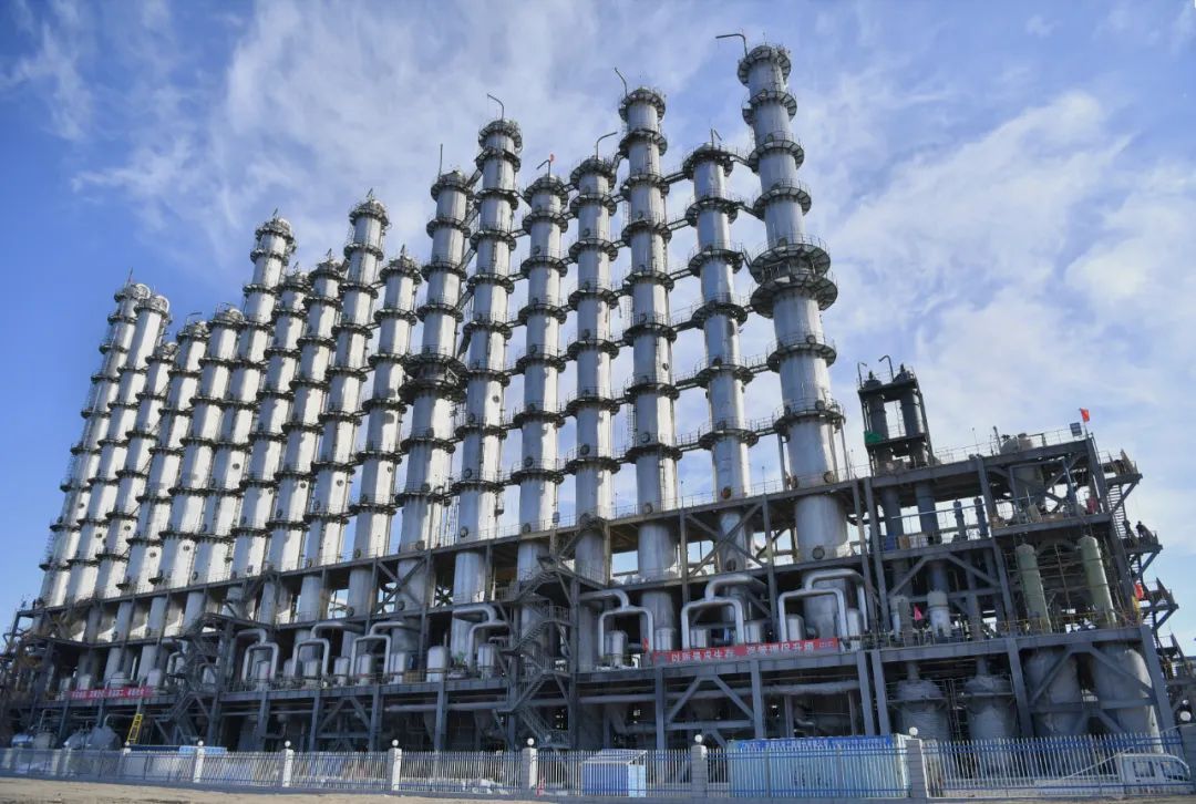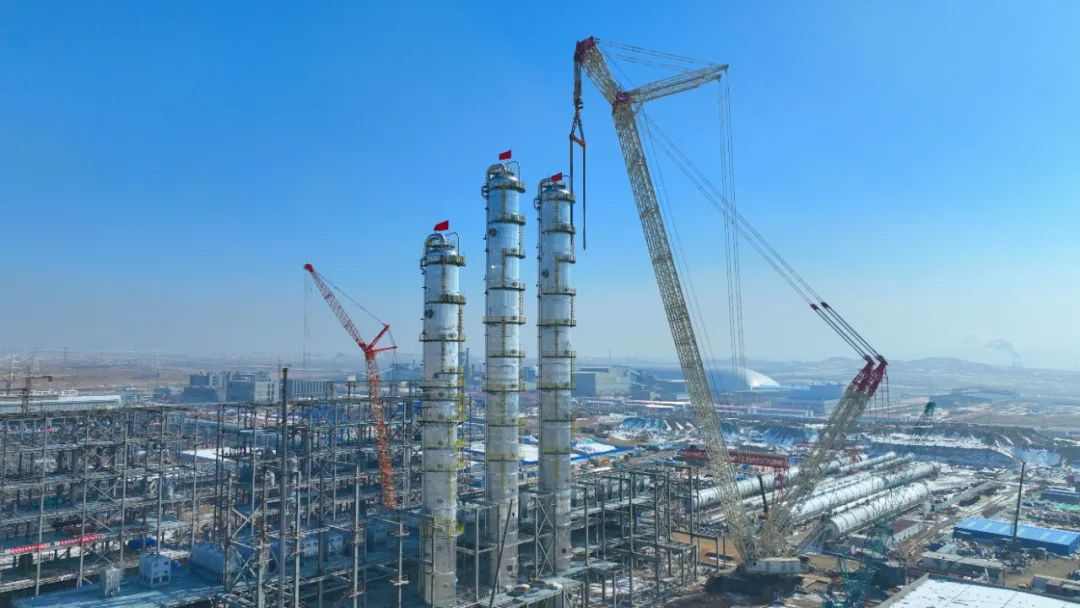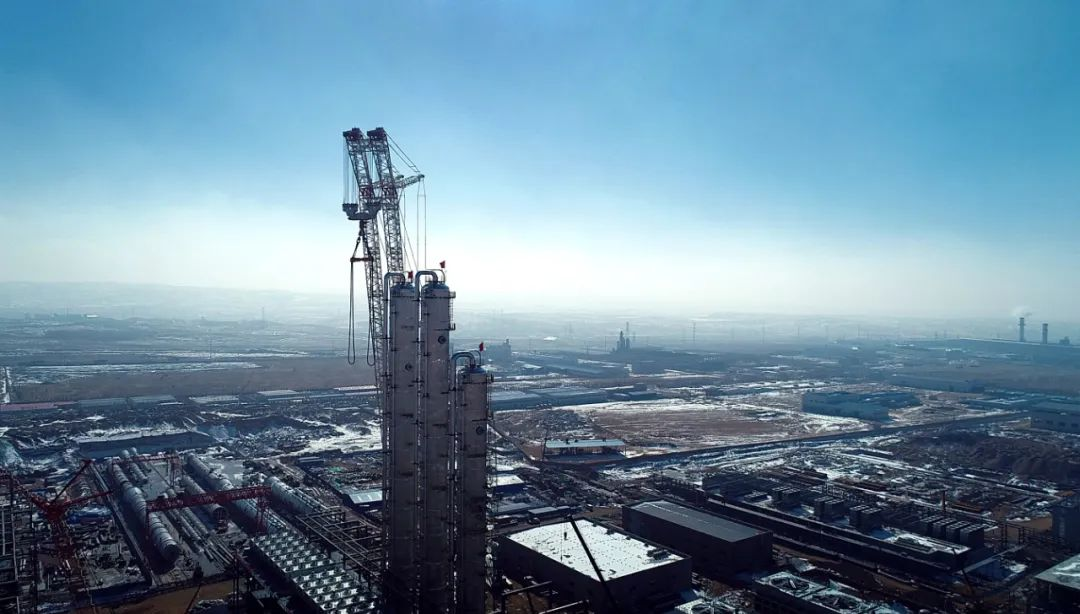 ▲2月22日,位于固阳县金山工业园区的弘元能源科技(包头)有限公司项目建设现场,从高空俯瞰正在建设的精馏塔。贾荣/摄