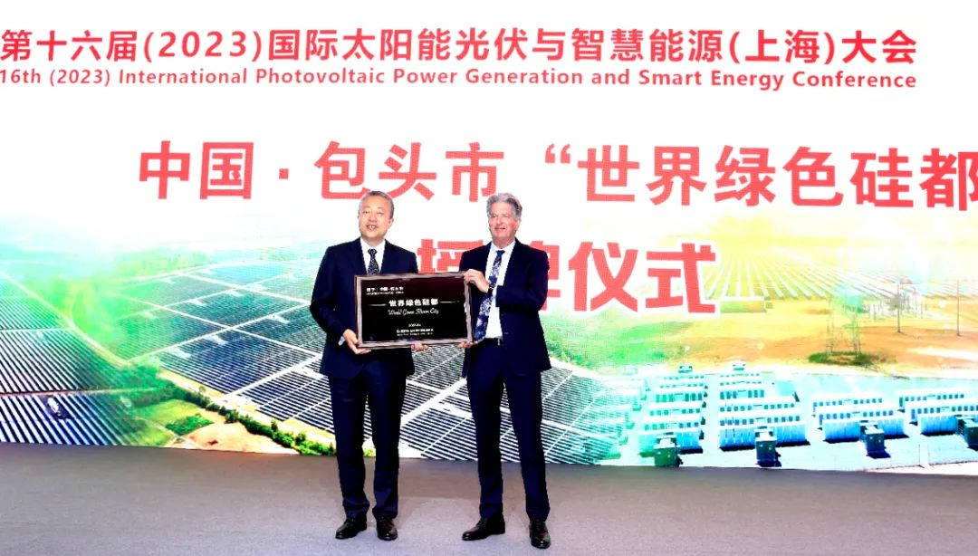 5月23日,第十六届(2023)国际太阳能光伏与智慧能源(上海)大会开幕式上,当被誉为“太阳能之父”的马丁·格林教授代表全球绿色能源理事会,把书写着“世界绿色硅都”的牌匾送到包头市委副书记、市长张锐手上时,世界级的硅都建设有了具象,科技和产业实现“双向奔赴”,过去与未来实现“无缝对接”。