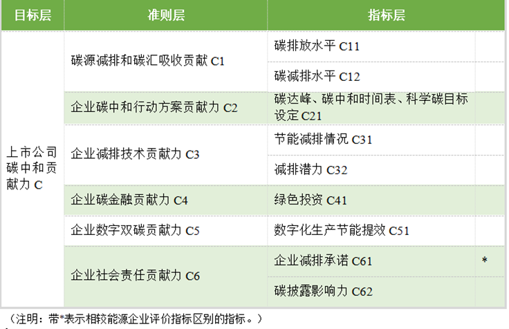 上市公司作为中国经济的重要组成部分,有责任也有义务积极参与减排行动。随着可持续发展观念深入人心,全社会包括资本市场逐渐重视企业的社会责任表现,ESG已经成为评价上市公司企业综合表现和指导投资者的重要标准,影响着企业在社会和市场上的生存与竞争力。上市公司碳中和贡献力评价指标体系的制定,是在能源企业评价指标的基础上结合国际国内对于上市公司的碳管控要求进行去粗取精,得出最终评价指标体系。