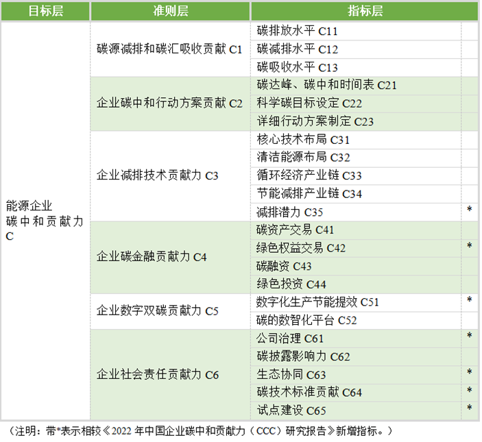 研究团队延续去年的标准,提出碳中和贡献力的六个维度指标:碳源减排和碳汇吸收贡献力C1、企业碳中和行动方案贡献C2、企业减排技术贡献C3、企业碳金融贡献力C4、企业数字双碳贡献力C5及企业社会责任贡献力C6。结合过去一年国际国内形势,为贴合最新低碳发展趋势,更全面评价能源企业碳中和贡献力表现,对评价指标体系主要进行了两方面的优化调整。首先,将原来碳数智化平台从指标层提升为第六个准则层评价维度企业数字双碳贡献力;其次,新增减排潜力、绿色权益交易、数字化生产节能提效、公司治理、生态协同、碳技术标准贡献、试点建设7项指标并修订权重,对能源企业碳中和贡献力进行评估。