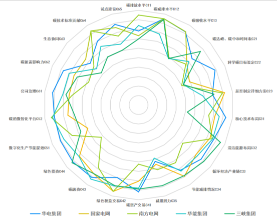 (1)在榜单位列前10家企业中,电力企业占比50%,分别有中国华电、国家电网、中国华能、南方电网及三峡集团,电力企业在碳源减排和碳汇吸收、碳金融、数字双碳方面普遍表现突出。碳减排水平方面,电力央企通过发展清洁能源,优化电力结构的方式给减排提供了很大的贡献。碳金融方面,电力企业碳资产交易、绿色权益交易、碳融资指标普遍表现优异。碳数智化平台方面,华电集团利用区块链技术建设碳核算管理、碳交易管理等全链条碳管理平台,实现智能化管理。