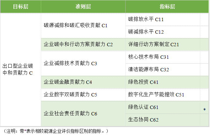 2023年5月17日,CBAM在欧洲议会获得通过,CBAM将于2023年10月1日生效,该法案的通过,意味着从今年10月1日起,所有的欧盟进口商需要报告钢铁、铝、化肥、水泥、氢、电力行业的产品温室气体排放。2023年6月14日,欧洲议会批准了临时协议,7月10日,欧盟理事会正式通过《新电池法规》。《新电池法规》对EV电池、LMT电池、可充电工业电池 (2KWh以上) 提出“碳足迹”要求并要求附上声明和标签。出口型企业碳中和贡献力评价指标体系的制定,是在能源企业评价指标的基础上结合国际国内对于出口型企业的碳管控要求进行去粗取精,得出最终评价指标体系。
