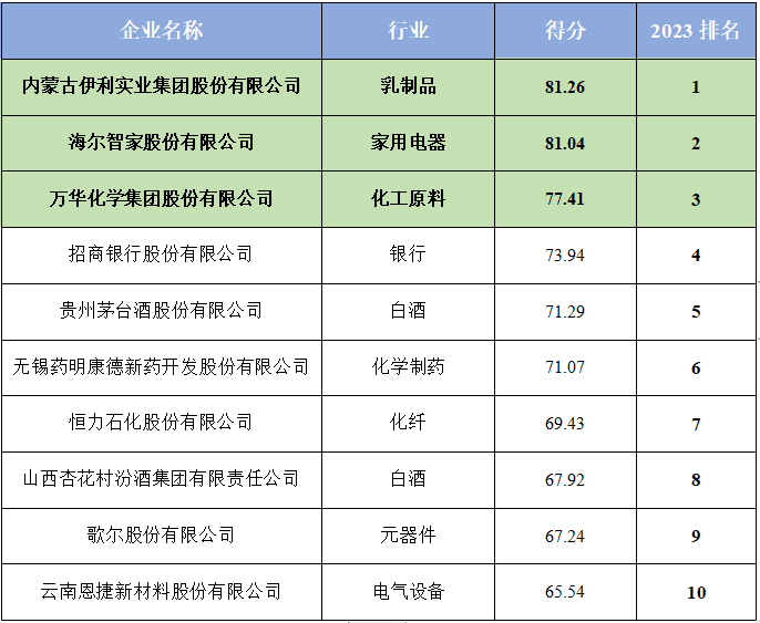 以财富、影响力及行业分布选取代表性上市公司。从评价结果来看,伊利集团、海尔智家及万华化学表现亮眼。分析显示,10强上市公司碳中和贡献力表现为:积极践行节能减排,助力国家“双碳”目标;绿色投资表现强劲,落实“双碳”目标深耕绿色金融;标杆企业带头制定行动方案,企业“双碳”规划仍需加强;国家和行业碳披露要求持续加强,企业披露工作仍需努力。