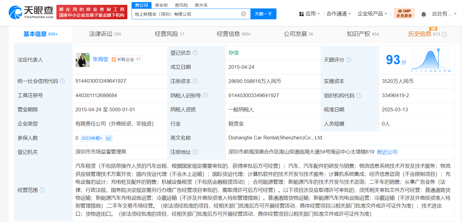 地上铁租车(深圳)有限公司成立于2015年4月,法定代表人为张海莹,注册资本约2.87亿人民币,经营范围含汽车租赁,汽车、汽车配件的研发与销售,物流信息系统技术开发及技术服务,物流供应链管理技术方案开发,国内货运代理,国际货运代理,计算机软件的技术开发与技术服务等。股东信息显示,该公司现由Ceningan Investment Pte. Ltd.、金庐斯集团有限公司、深圳市新创绿能投资有限公司及上述新增股东等共同持股。