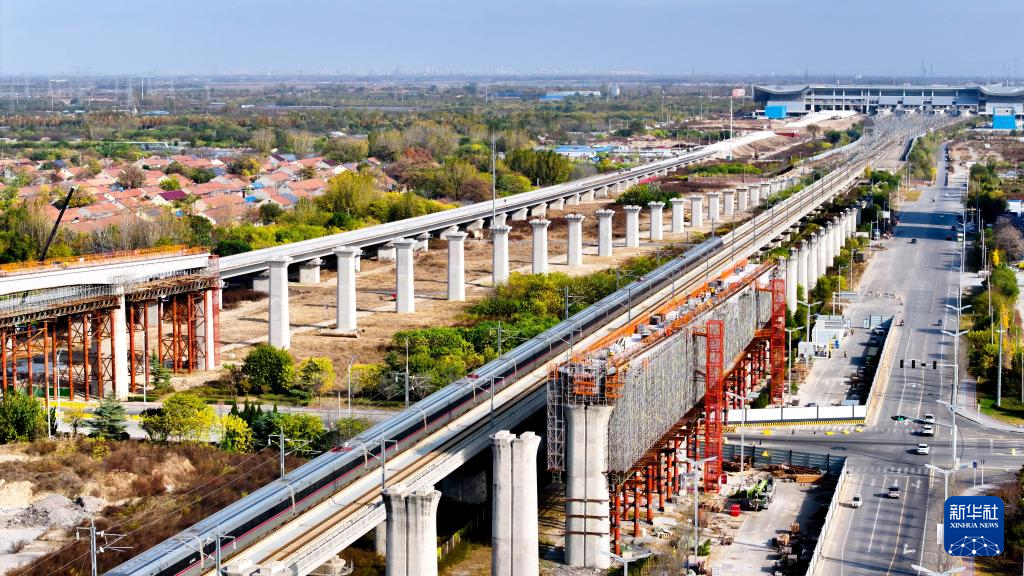 11月16日,由中铁十局承建的济(南)青(岛)高铁潍东上行联络线跨省道222和潍坊市蓝天路连续梁顺利合龙。据悉,潍东上行联络线是连接济青高铁和(天)津潍(坊)高铁的关键纽带,将为鲁北地区和山东半岛地区的互联互通注入强劲动力。 新华社记者 郭绪雷 摄