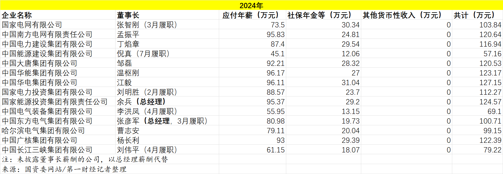 国资委近日公布中央企业负责人2024年薪酬信息,其中包括14家电力企业。