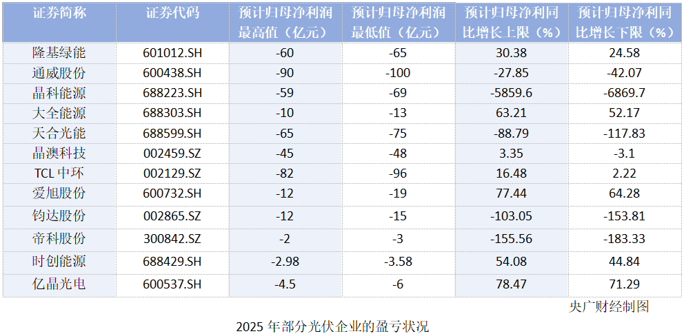 这些光伏企业中,晶科能源2025年由盈转亏,通威股份、天合光能等再次出现亏损扩大的状况,隆基绿能、TCL中环、大全能源(688303.SH)、爱旭股份(600732.SH)则出现减亏。
