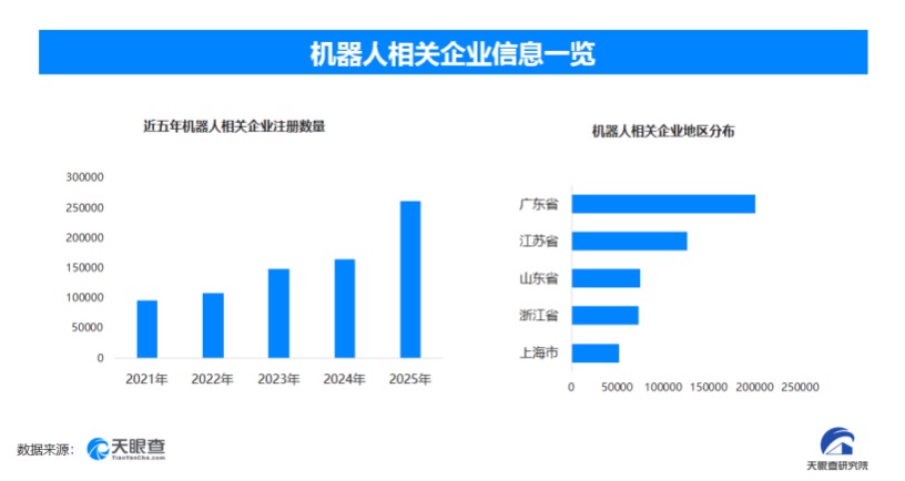 天眼查专业版工商信息数据显示,截至目前我国现存在业、存续状态的机器人相关企业超105.8万家。其中,2025年新增注册相关企业超26.1万余家,从企业注册数量趋势来看,近五年间,机器人相关企业的注册数量呈现出逐年增长的态势,并在2025年达到顶峰。