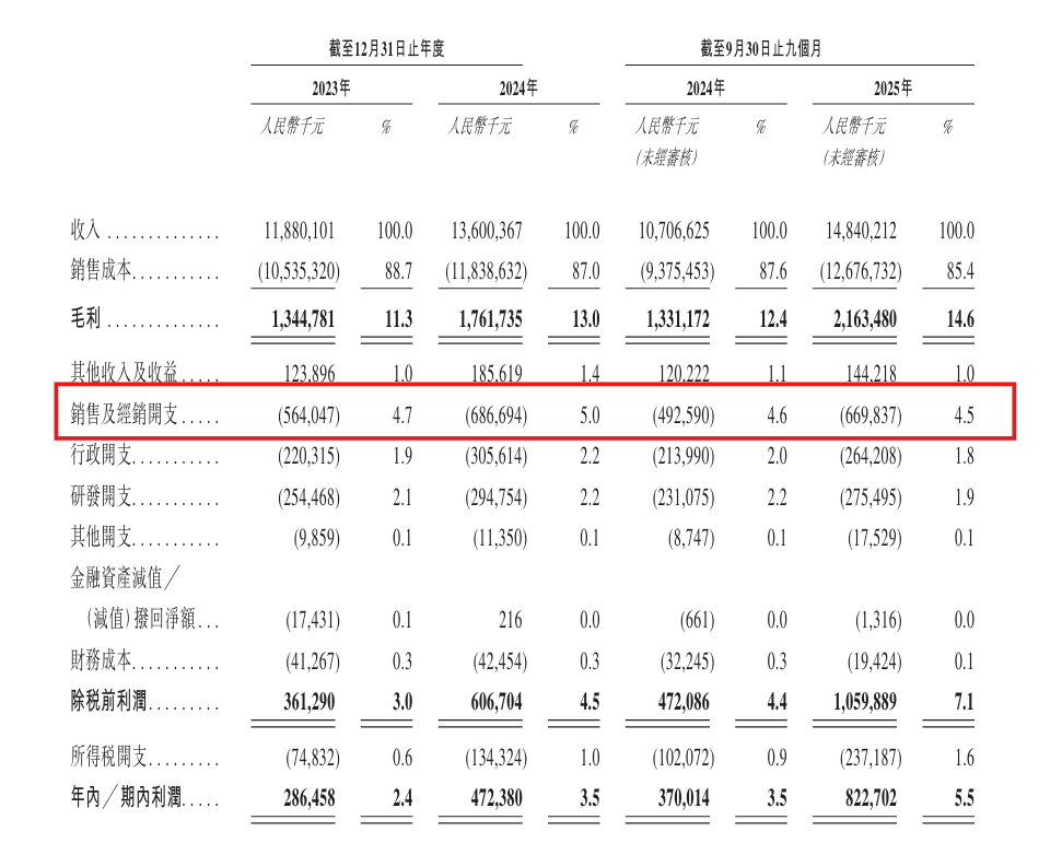 2023年、2024年及2025年前9个月,公司的销售及经销开支分别为5.64亿元、6.86亿元及6.69亿元,逐年走高,占比分别为4.7%、5%及4.5%。