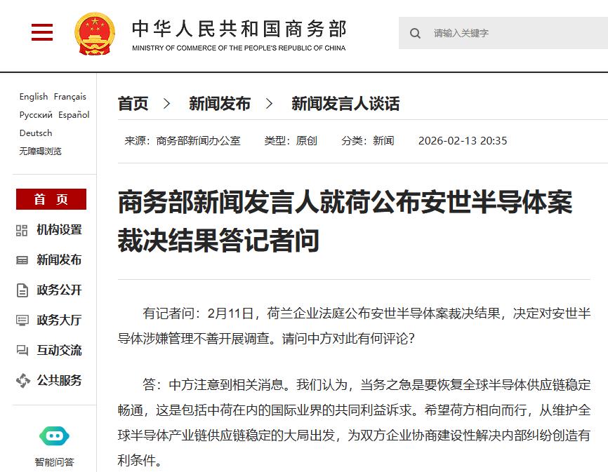 有记者问:2月11日,荷兰企业法庭公布安世半导体案裁决结果,决定对安世半导体涉嫌管理不善开展调查。请问中方对此有何评论?