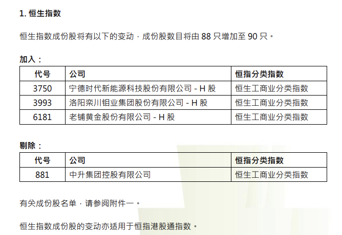 恒生指数公司宣布,恒生指数成份股数目将由88只增加至90只。新加入宁德时代、洛阳钼业和老铺黄金,剔除中升集团控股有限公司。