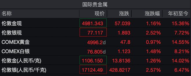 2月13日早盘,现货黄金、白银转涨,至13日12:00左右,现货黄金报价4981美元/盎司,现货白银报价77美元/盎司。金银比回升至64.6,该比值此前一度跌破50。(记者注:金银比是判断白银相对黄金估值高低,以及市场情绪在避险与增长之间切换的重要参考工具。计算公式为:金银比=黄金价格/白银价格。)