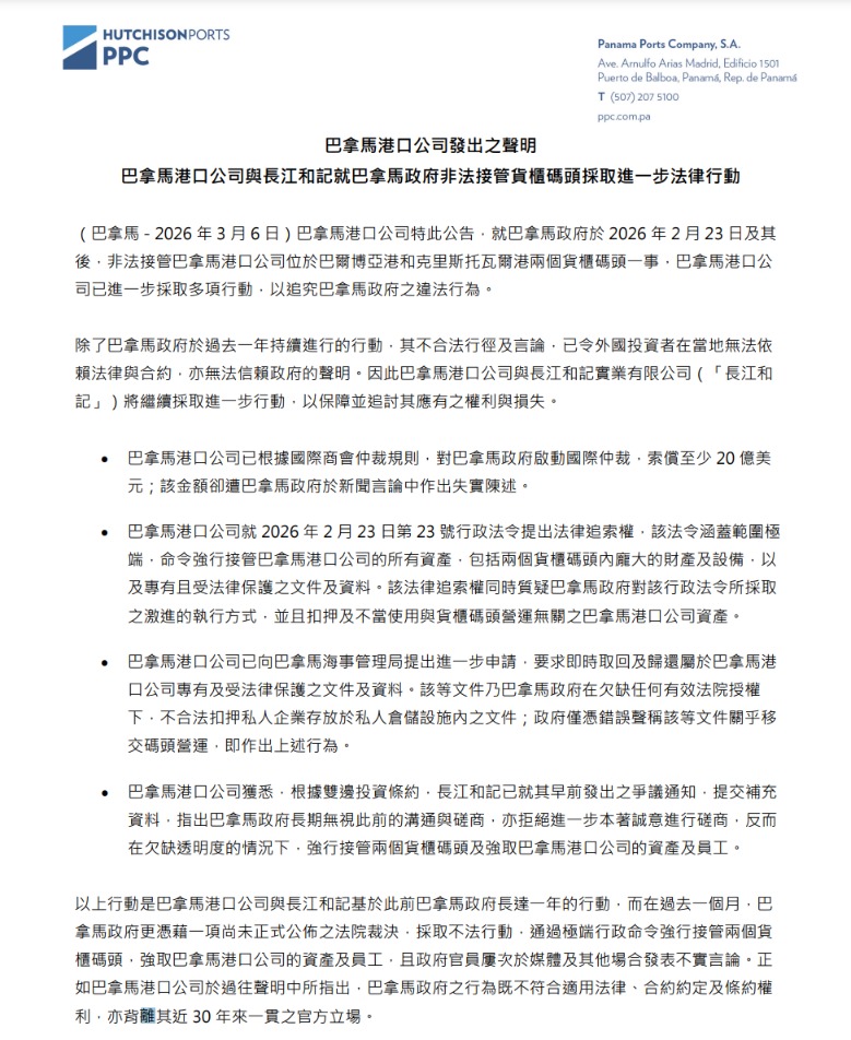 香港长江和记实业有限公司旗下巴拿马港口公司3月6日发声明,表示就巴拿马政府于今年2月23日及其后非法接管该公司位于巴尔博亚港和克里斯托瓦尔港两个集装箱码头一事,已进一步采取多项行动,以追究巴拿马政府的违法行为。巴拿马港口公司已根据国际商会仲裁规则,对巴拿马政府启动国际仲裁,索偿至少20亿美元。
