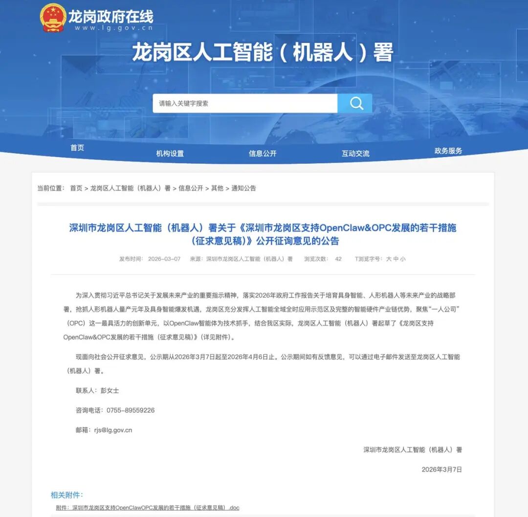 值得注意的是,为抢抓智能经济发展机遇,深圳市龙岗区于3月7日发布《深圳市龙岗区支持OpenClaw&OPC发展的若干措施(征求意见稿)》(以下简称:“龙虾十条”),拟以“零成本启动”为核心亮点,面向全球智能体开发者和OPC(One Person Company,一人公司)创业者抛出橄榄枝,打造全球智能体创业首选地。