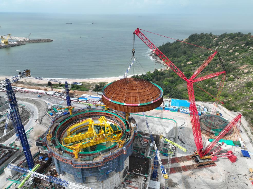中国能源网讯 中国能源报记者7月14日从中广核获悉,当天10时26分,广东陆丰核电6号机组穹顶成功吊装就位,标志着这台“华龙一号”核电机组反应堆厂房成功封顶,工程建设正式由土建施工阶段全面转入设备安装阶段。