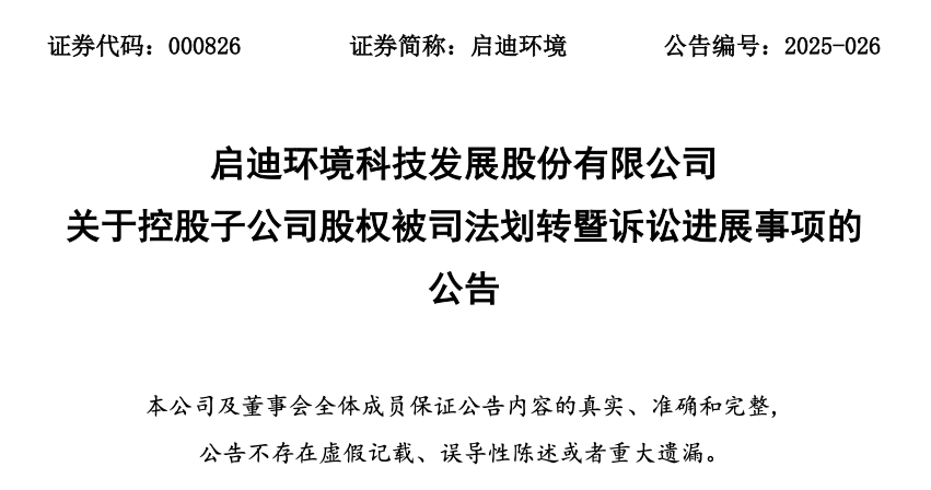 因启迪环境未能及时支付股权转让款项,人保基金于2022年向法院提起诉讼,要求启迪环境支付剩余股权转让款4.71亿元及违约金。法院已于2024年对启迪环境持有的浙江启迪93.419%股权进行冻结,并于2025年3月进行拍卖,但因无人出价而流拍。最终,法院裁定将该股权作价4.9亿元抵偿人保基金的债务,导致启迪环境不再持有浙江启迪股权,浙江启迪不再是启迪环境的并表子公司。