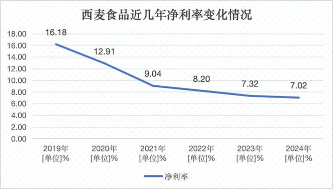 净利率持续走低的态势更令人担忧。2019年—2024年,公司净利率分别为16.18%、12.91%、9.04%、8.2%、7.32%、7.02%,连续五年下滑,反映出企业在成本管控与运营效率上面临的双重挑战。