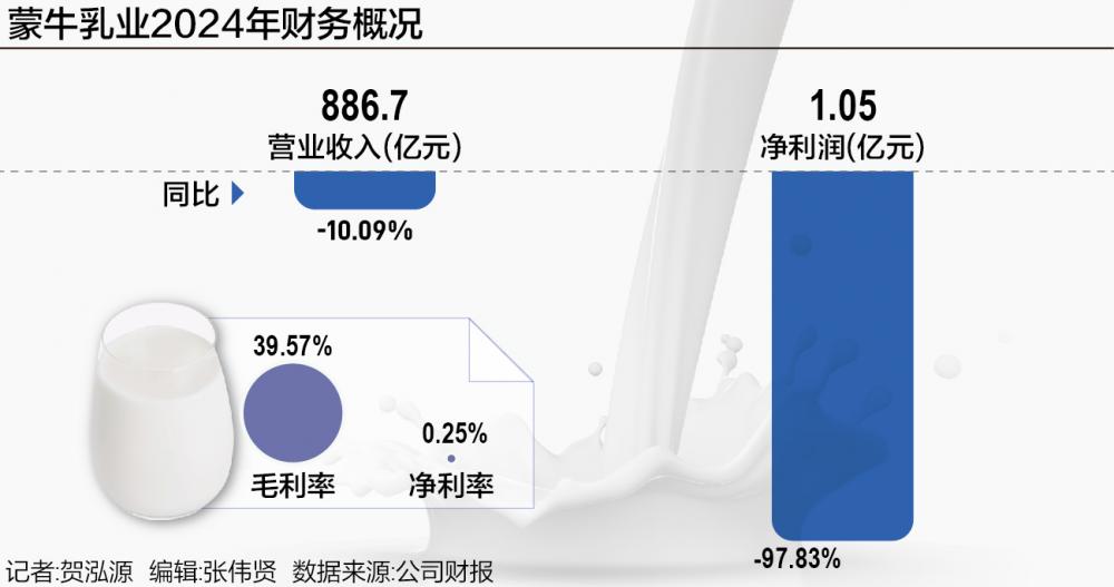 2025年3月26日晚,该公司披露业绩。财报显示,在2024年,蒙牛营收886.748亿元,同比下滑10.1%;归母净利润1.045亿元,同比下滑97.8%。