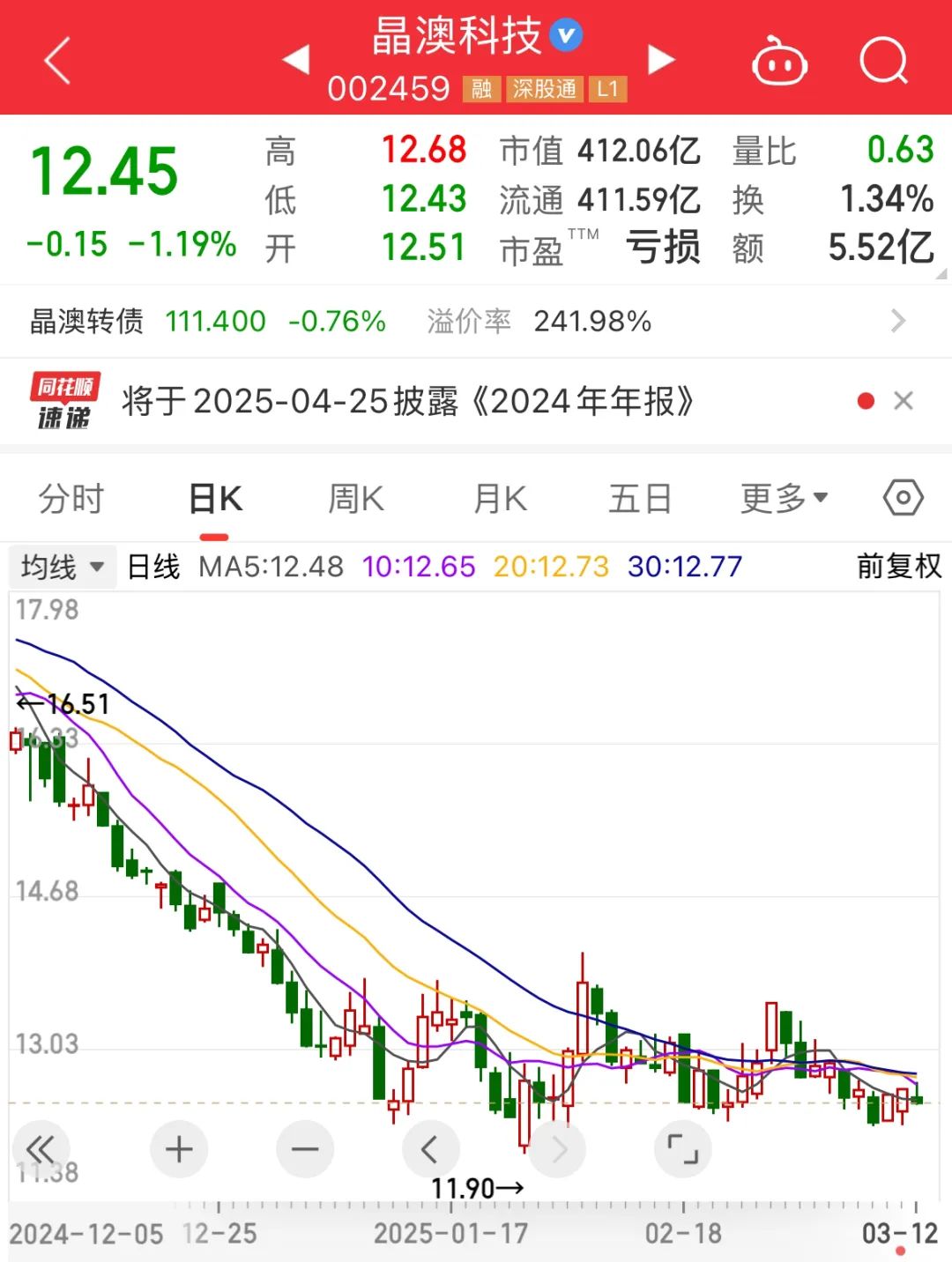 3月12日,晶澳科技每股报12.45元,跌幅1.19%,总市值412.06亿元。