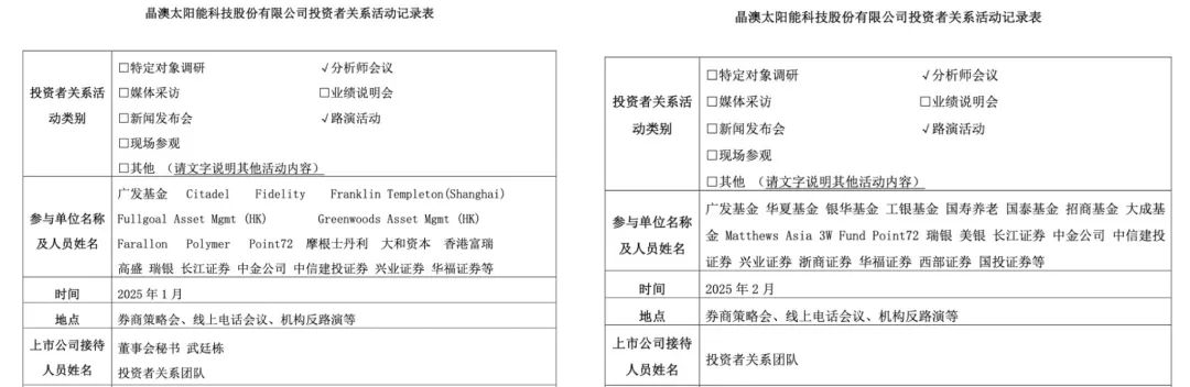 值得注意的是,目前距离晶澳科技公布2024年年报还剩不到一个月。此前,武廷栋曾以董秘身份出席晶澳科技1月召开的券商策略会、线上电话会议以及机构反路演等场合。而在公司2月投资者关系活动记录表中,已没有武廷栋的身影。