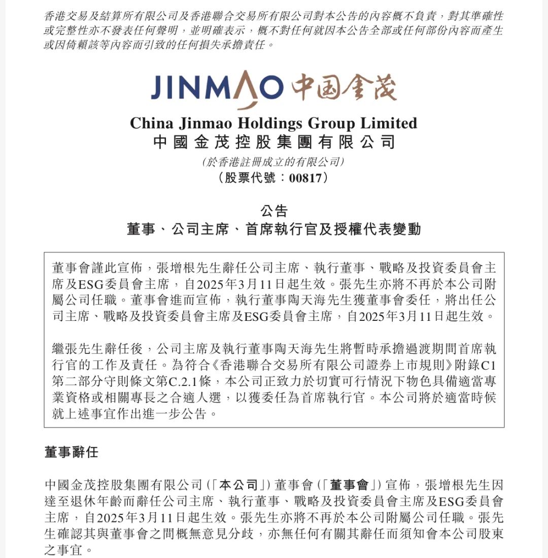3月11日晚间,金茂对外披露公告称,张增根因到退休年龄而辞任公司主席、执行董事、战略及投资委员会主席及ESG委员会主席。
