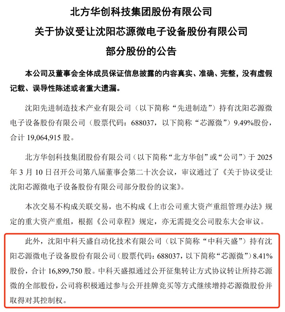 不过北方华创3月10日晚间发布公告称,该公司将积极通过参与公开挂牌竞买等方式,继续增持芯源微股份并取得对其控制权。