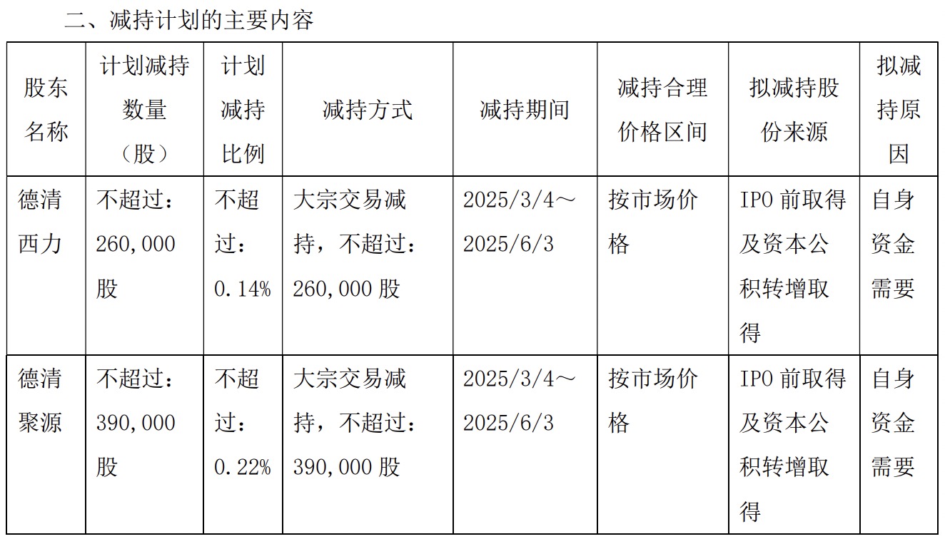同时,公司股东德清聚源科技信息咨询合伙企业(有限合伙)(以下简称“德清聚源”)计划在同一期间通过大宗交易方式减持不超过39万股公司股份,占公司总股本的0.22%。