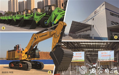 图①柳工电动装载机图②柳工挖掘机智慧工厂