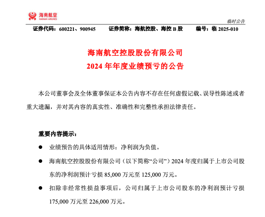 近日,海南航空控股股份有限公司(以下简称“海航控股”或“公司”)发布2024年年度业绩预亏的公告。公司预计2024年度归属于上市公司股东的净利润预计亏损85,000万元至125,000万元。扣除非经常性损益事项后,公司归属于上市公司股东的净利润预计亏损175,000万元至226,000万元。