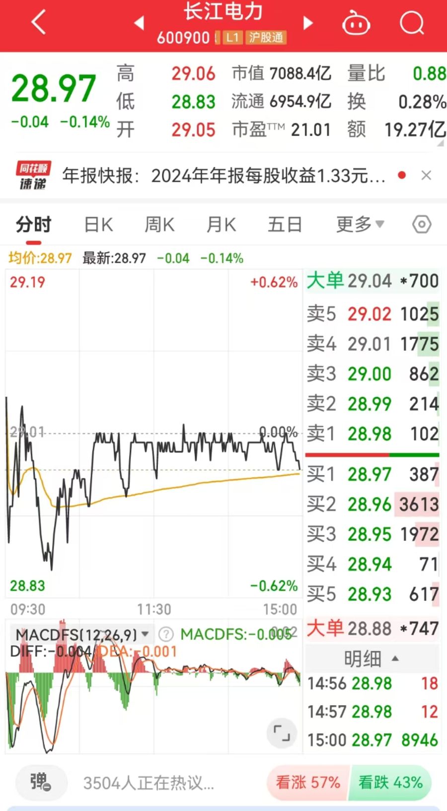 截至1月20日收盘,长江电力收跌0.14%,报28.97元/股,总市值7088.4亿元。