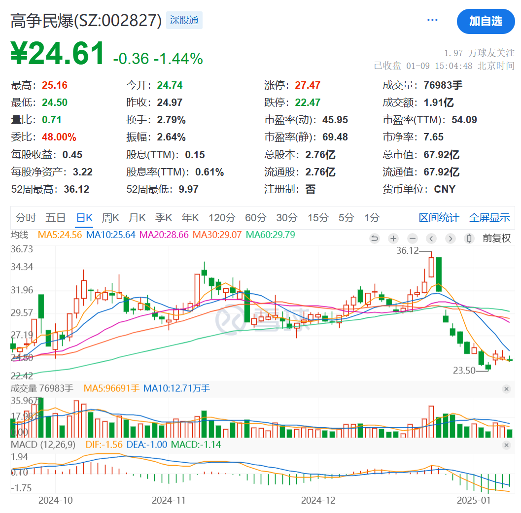 二级市场上,截至9日收盘,高争民爆跌1.44%报24.61元/股,最新市值67.92亿元,近一月累计下跌近两成。