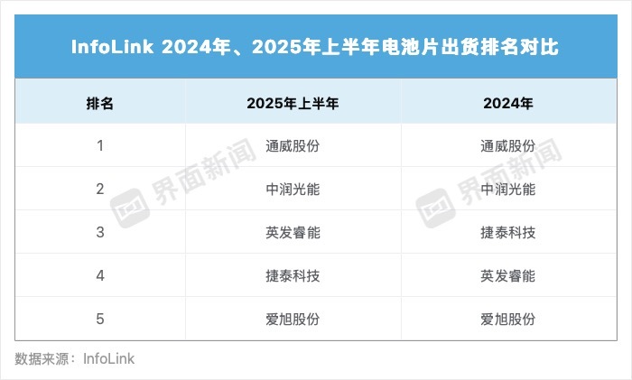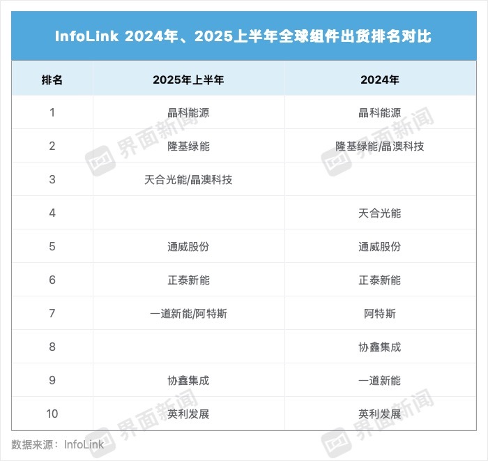InfoLink也指出,其排名出货数据采用自身供需数据库,基于与厂商的调研结果整理,最终数据仍以公司官方公布为准。数据统计自百兆瓦,出货总量相差不超过5%的厂家将并列排名。