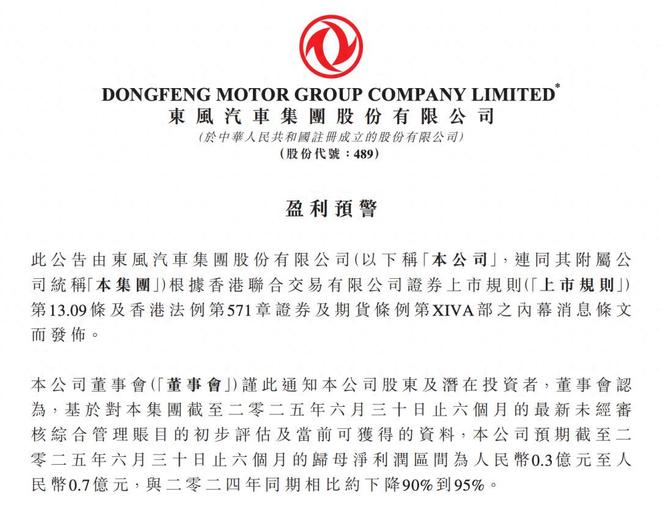 8月8日,东风汽车集团股份有限公司(下称“东风汽车集团”)发布《盈利预警》公告显示,2025年上半年,东风汽车集团归母净利润预计为0.3亿元至0.7亿元,同比下滑90%至95%。