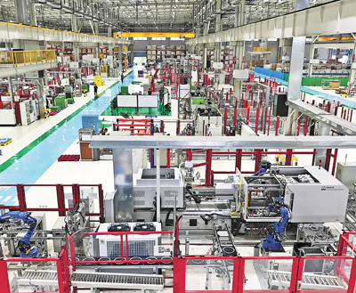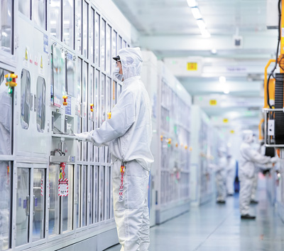 图为管理人员在宁德时代电芯制造生产线上调试设备。