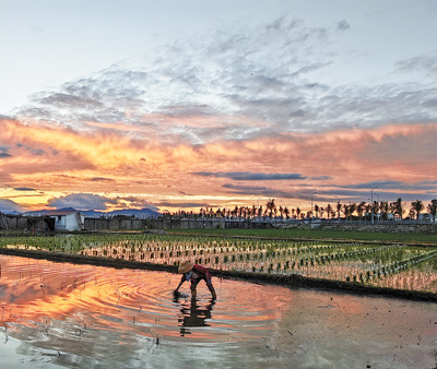 图为育种工人清理水稻田里的杂草,为育秧做准备。