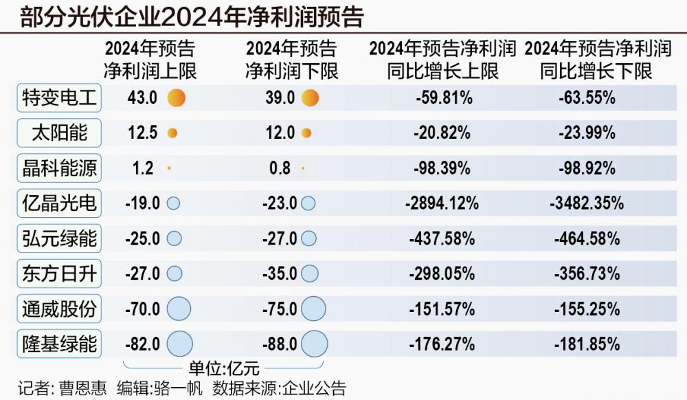 截至1月20日,隆基绿能(601012.SH)、通威股份(600438.SH)、晶科能源(688223.SH)、大全能源(688303.SH)、特变电工(600089.SH)、双良节能(600481.SH)等24家A股光伏企业发布2024年度业绩预告,整体亏损超过242亿元,仅有6家公司实现盈利。
